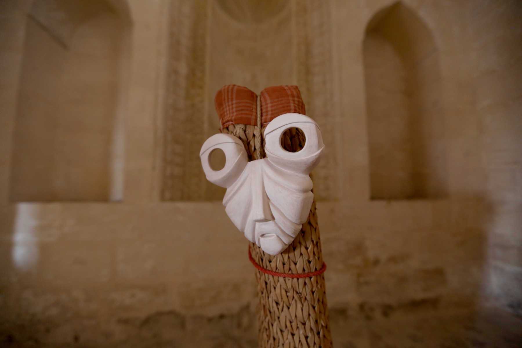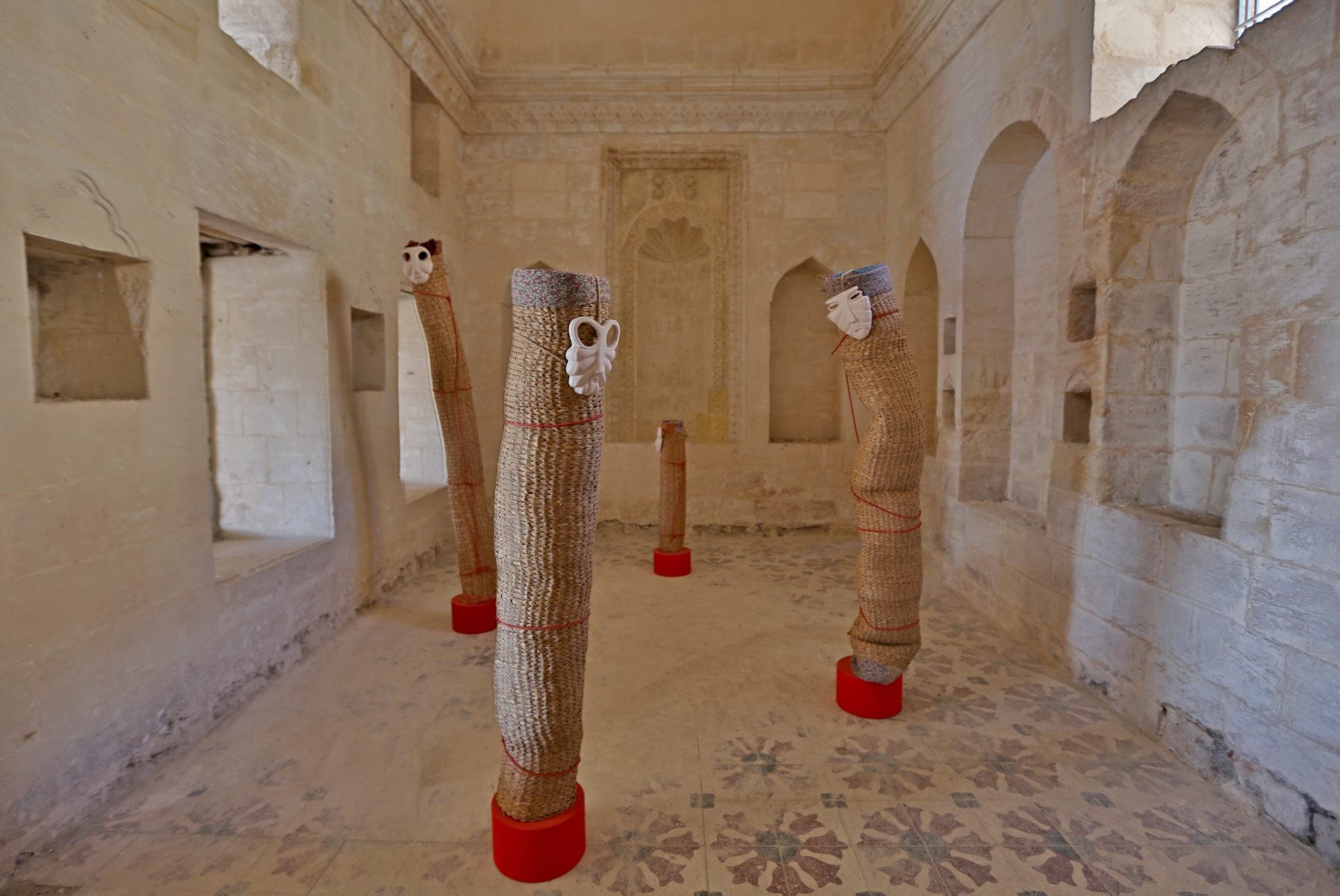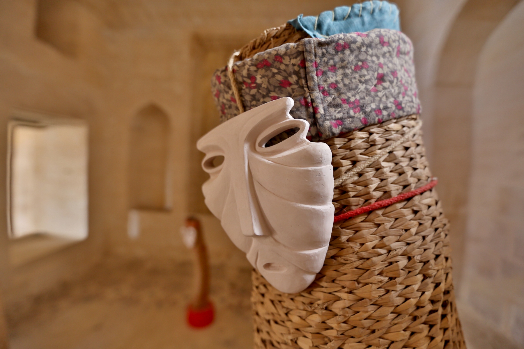 For the installation “Buried Intentionally”, Aslı Çavuşoğlu produced four ceramic masks inspired by portraits taken during past crisis periods in her personal and professional life. The starting point of the work is based on the intentional burial of sacred structures in and around Göbeklitepe. The functions of these sites have not yet been fully known, yet there are theories suggesting that these sites had completed their missions and evidently intentionally filled in. The artist, making a connection with the ritual of burying the dead wrapped in straw bedrolls that she encountered during her trip to Mexico, now deliberately buries the personas she left behind utilizing pre-owned hand woven bedrolls from Mardin and ceramic masks.